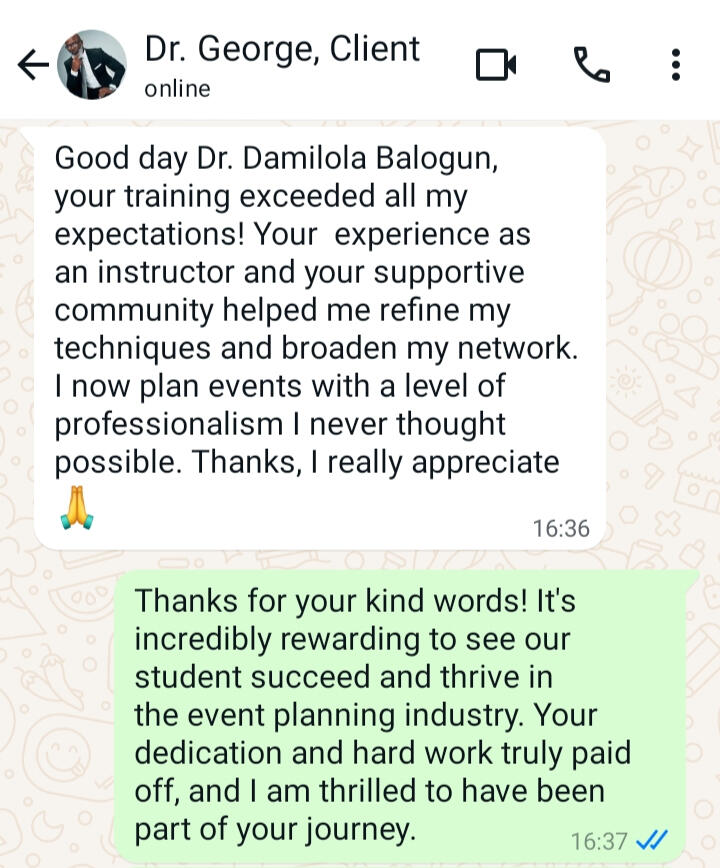 Dr. Damilola Balogun is a trained Dental surgeon who found a passion for event planning about 18 years ago while in the Medical school.She nurtured this passion into a thriving event planning company. She founded The Wedding People Nigeria out of a specific desire to just be a wedding planner. However, a couple of years later, satisfied couples and clients started requested for planning services for non-wedding events, this gave birth to TWP Event she currently runs both planning companies under the TWP Event CompanyThe desire to create and facilitate a training program for budding and established events planners was born from her personal experience of limited former training when she started. She had to learn and under-study while working and go through many years/hundreds of events to perfect her craft.Now, she can boldly say she has hacked the secrets of executing seamless events and satisfying her clients and is ready to help others crack the code too. Through her unique teaching style and witty personality, she will be breaking